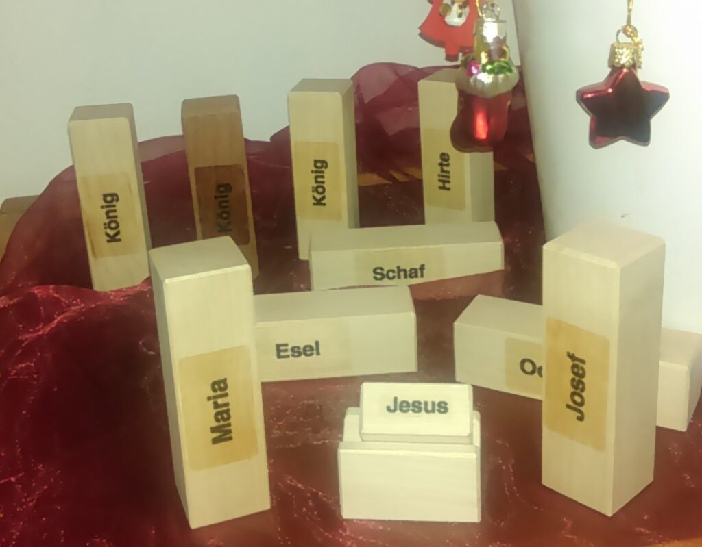 In einem Jahr hat sie zu diesem Zweck MICH mitgenommen und vorne auf dem Pult aufgebaut. Die Gesichter hättet ihr sehen sollen! Und erst die Kommentare: „Sind die Klötzchen aus dem Kindergarten?“ „Wo haben Sie das denn her?“ „Das ist doch keine Krippe!“