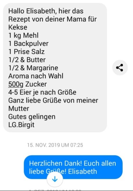 Eines Tages traf die Tochter (also meine jetzige Besitzerin) auf dem Friedhof eine frühere Nachbarstochter, Birgit! Die beiden unterhielten sich über ihre Mütter und dabei kam das Gespräch auch auf das Spritzgebäck, das immer großzügig auch in der Nachbarschaft verteilt wurde. Meine jetzige Besitzerin nutzte die Gelegenheit und fragte, ob denn auch das Rezept mal den Weg zur Nachbarin gefunden hätte!