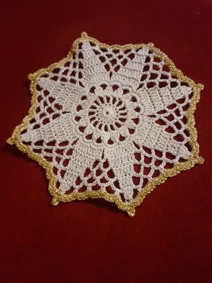 Ich bin ein Spitzendeckchen, mit viel Liebe und Goldfäden gehäkelt.