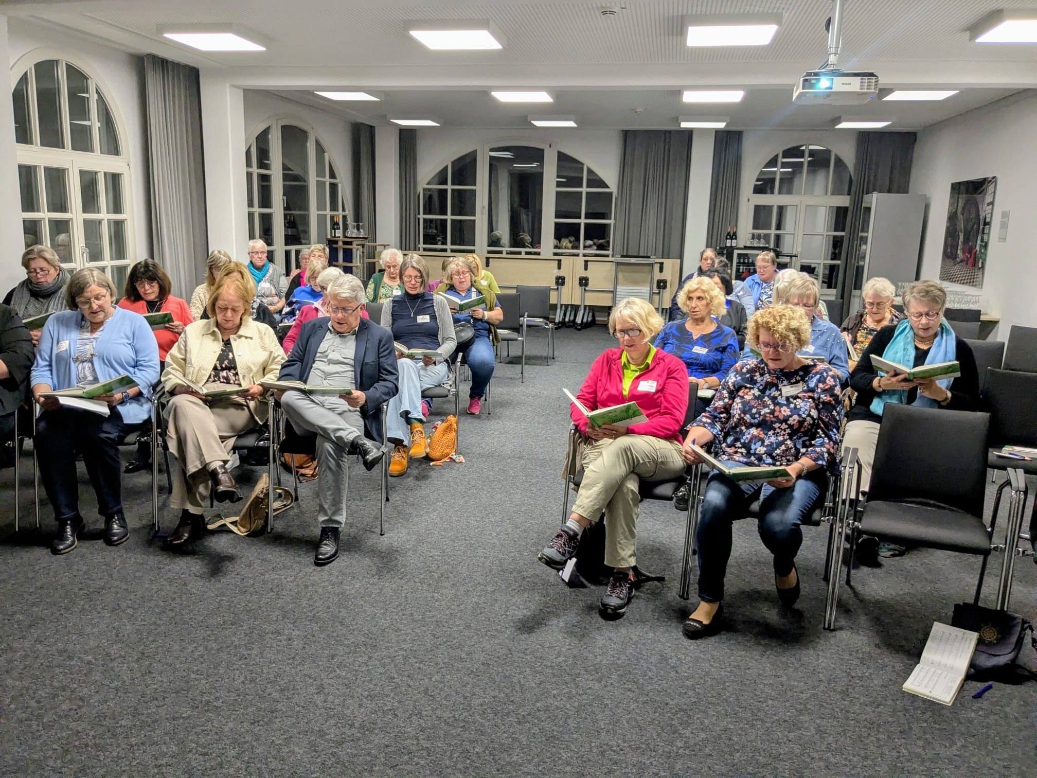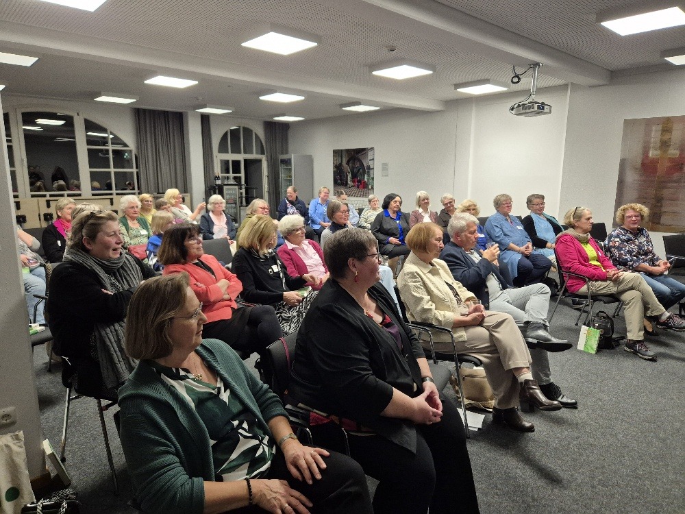 Am Freitag, 7.11., stand der Studientag ganz im Zeichen der Umgestaltung der Kirchenlandschaft im Bistum Essen. Zum Prozess „Christlich leben. Mittendrin“ informierte Programm-Manager Johannes Vutz über Ziele, Inhalte, Ablauf und den aktuellen Stand des Projekts. Im Anschluss stellten die Teilnehmerinnen Fragen und machten kritische Anmerkungen – insbesondere dazu, wie und an welcher Stelle der größte Erwachsenenverband im Bistum Essen, die kfd, in den Prozess eingebunden ist oder sich selbst einbringen kann. Johannes Vutz rief dazu auf, bis zum 15. Februar 2026 eigene Stellungnahmen einzureichen und sich auch vor Ort aktiv einzubringen.