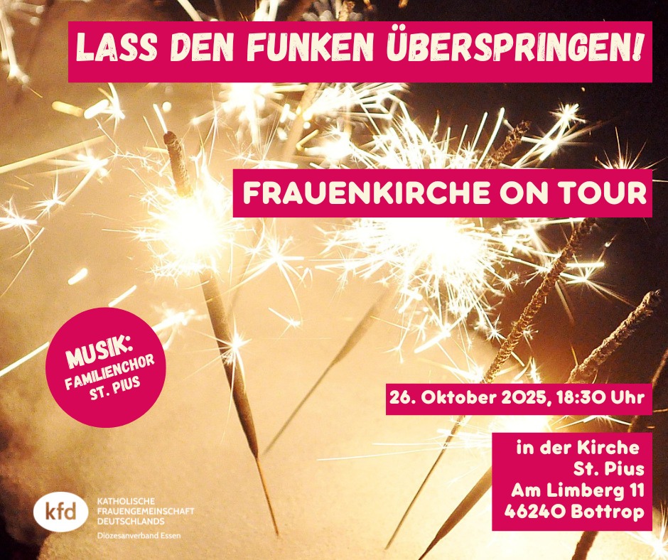 Die Tour der Frauenkirche geht weiter und führt diesmal nach Bottrop. Diesmal laden die kfd-Frauen aus St. Pius die Frauenkirche ON TOUR ein und freuen sich auf viele Frauen, die diese besonders gestaltete Wortgottesfeier von Frauen und für Frauen mitfeiern. Im Anschluss gibt es wieder eine Begegnung mit Getränken und Knabbereien.