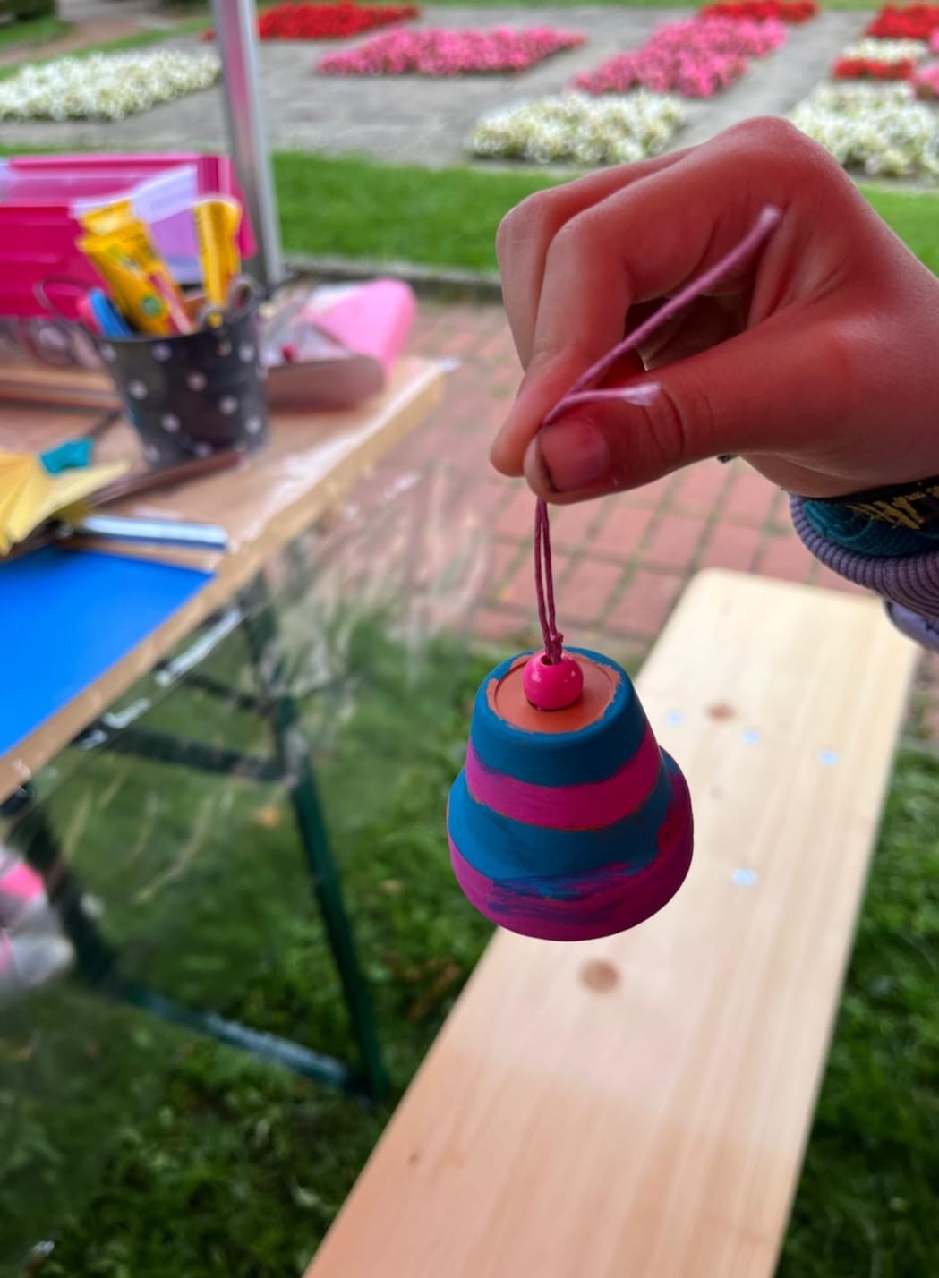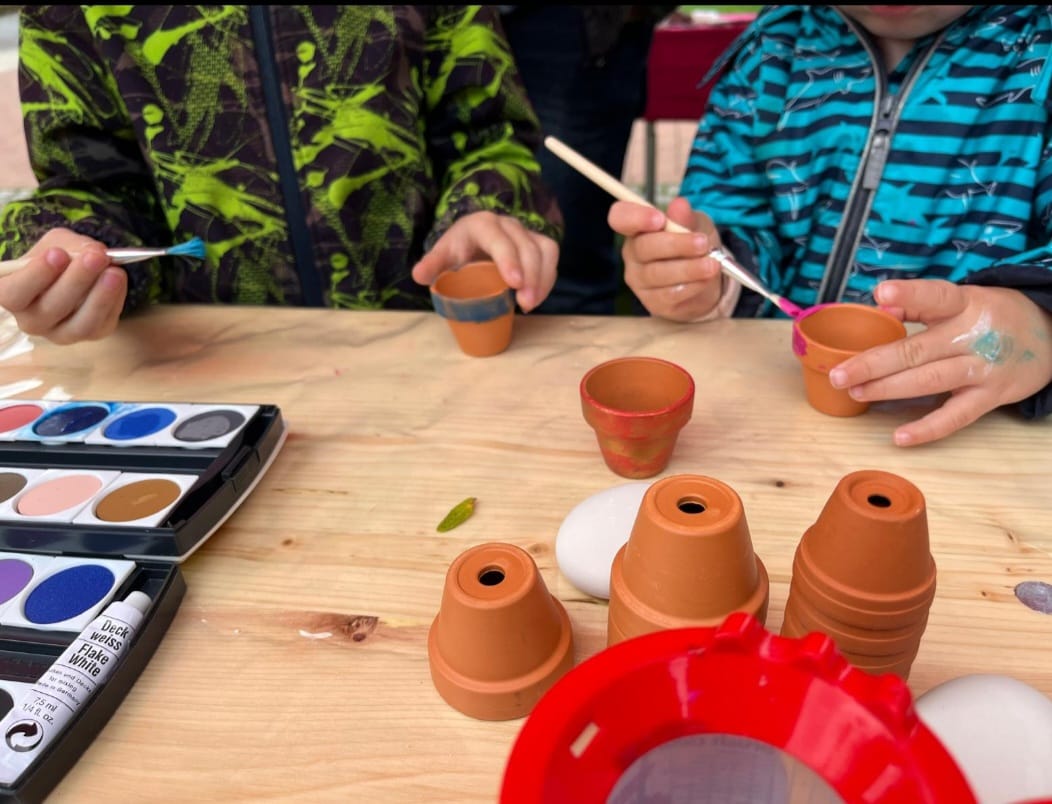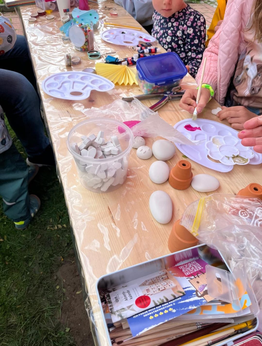 Während Marlene Berner und Ruth Felker beim Bemalen der Steine und Blumentöpfe, dem Gestalten der Lesezeichen und dem Falten der Papier-Igel behilflich waren, konnten mit Müttern und Vätern Gespräche geführt werden.